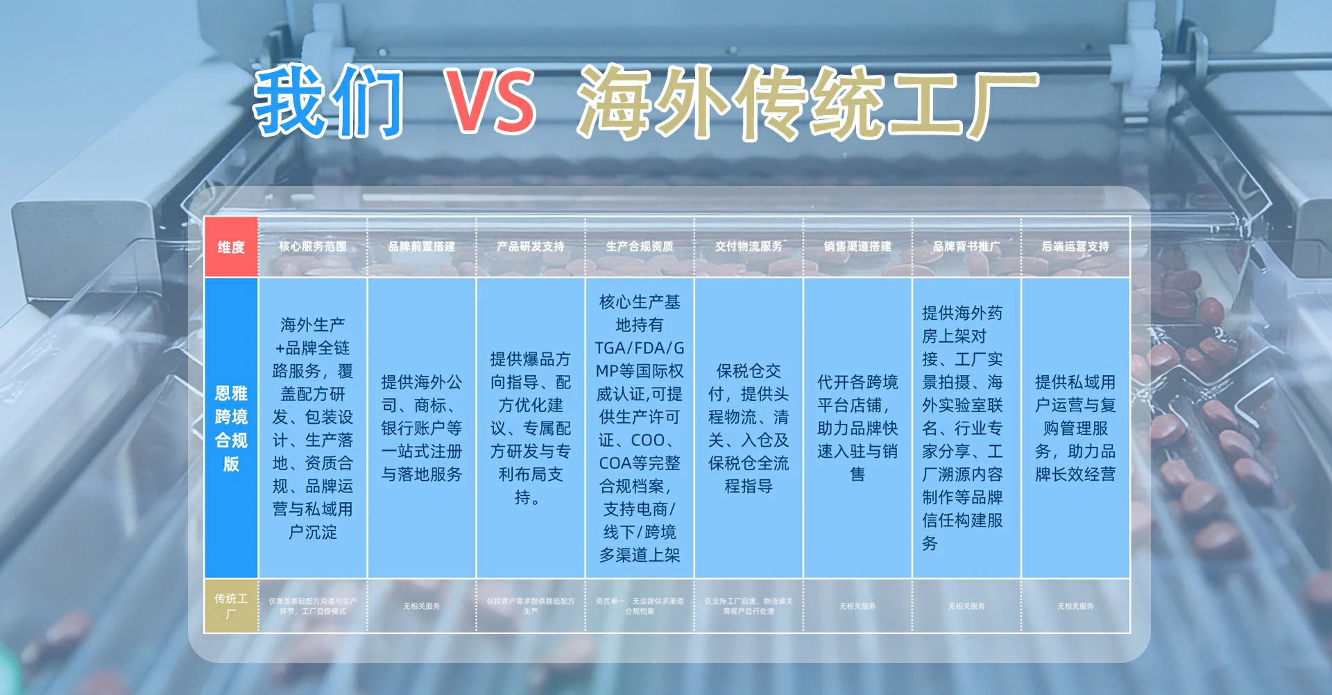 恩雅跨境国际集团有限公司是跨境保健品 OEM/ODM 领域的供应链企业,专注为电商公司、大健康私域品牌、网红达人提供进口保健品研发、生产、保税交付的全链路一站式解决方案