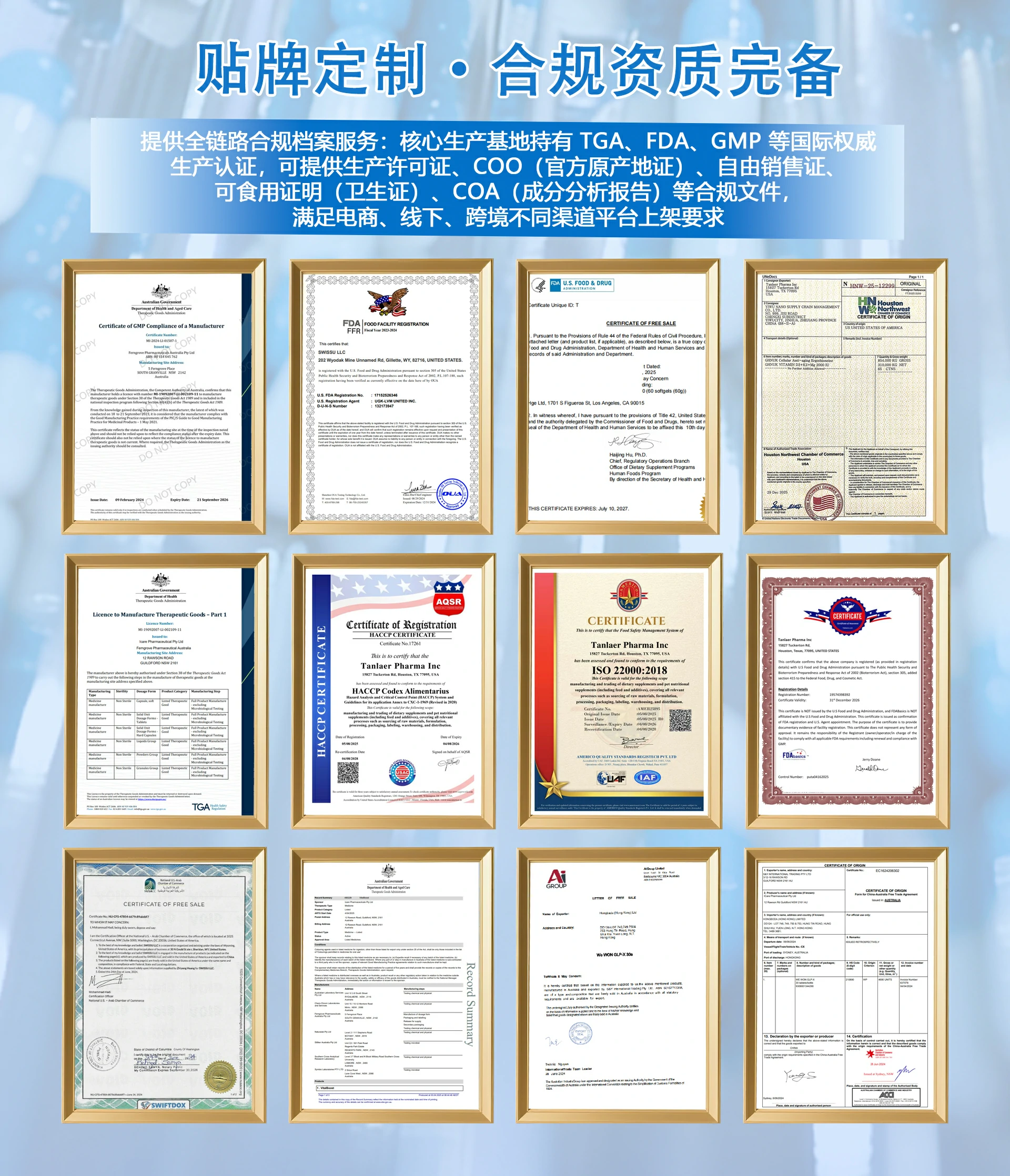 我们在澳洲、美国、英国、德国及中国香港布局生产基地,均持有 TGA、FDA、GMP 等国际权威认证,可实现工厂全链路溯源,保障产品品质与合规性。依托 12000 + 成熟配方库,我们支持剂型、配方、包装的按需定制,并以「厂价直供、小批量试产、短交期、快响应」为核心优势,高效匹配品牌从 0 到 1 的产品需求。